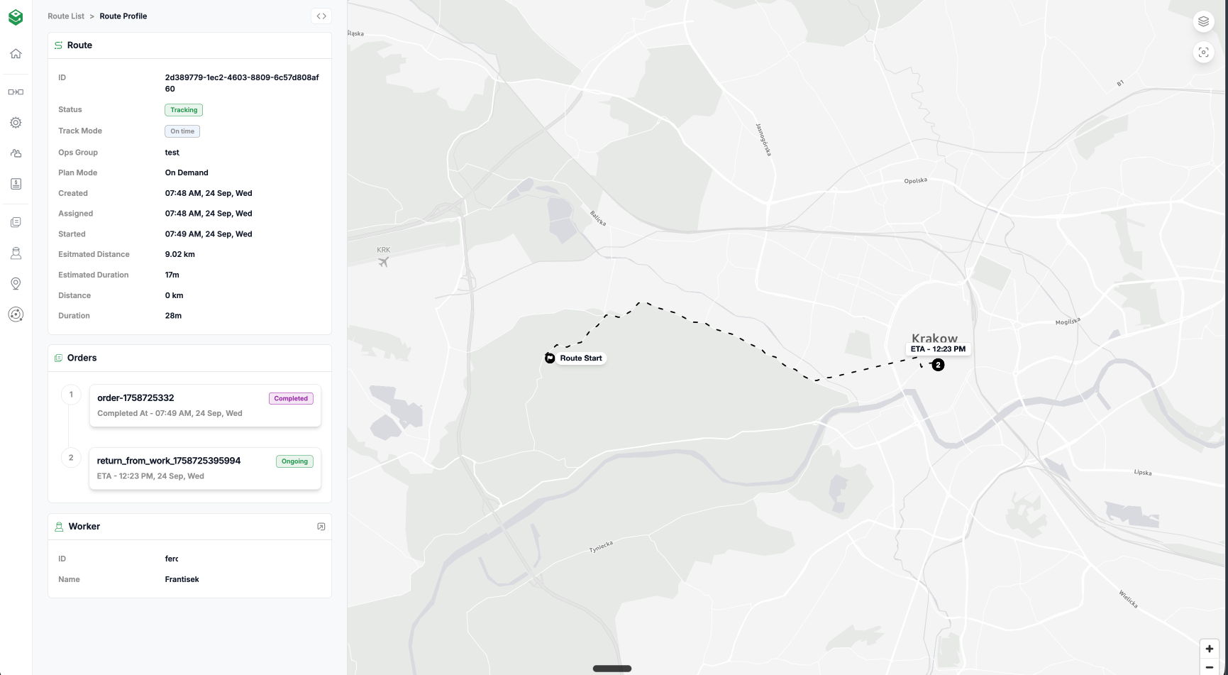 The Route view is an embeddable view that provides the details of all the Orders that are being worked on by a Worker on a given day. When your use case requires Workers to visit multiple locations to complete a job, the Route view can provide visibility into the different legs of the journey of an individual worker for the job.